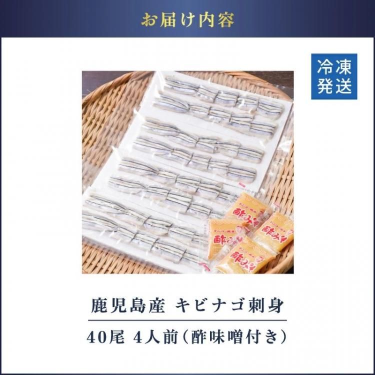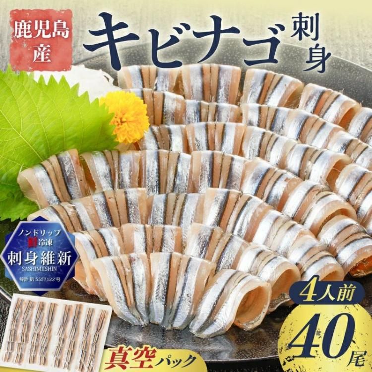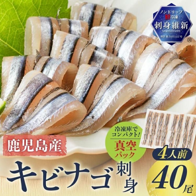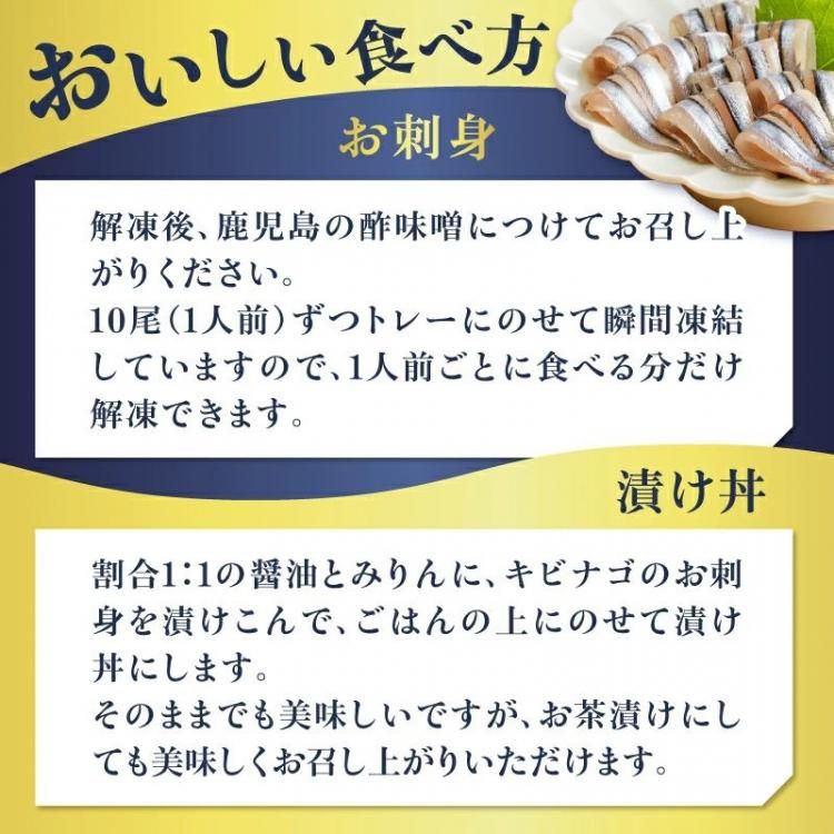 キビナゴのお刺身4人前(10尾×4パック)です。 鹿児島魚類市場に、その日に揚がったキビナゴをすばやくお刺身用におろし、真空パック。 そのまま-30度のノンドリップ急速冷凍をしますので、市場の鮮度のままお届けが可能です。 商品は10尾(1人前)ずつトレーにのせて瞬間凍結していますので、1人前ごとに食べる分だけ解凍できます。 また、鹿児島で一般的に使われる酢味噌もお付けいたします。 鹿児島本場のキビナゴをご堪能ください。