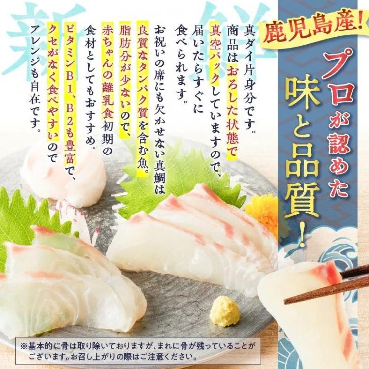 真ダイ片身分です。 商品はおろした状態で真空パックしていますので、届いたらすぐに食べられます。 真ダイは、おめでたい席に欠かせない縁起物。 ご贈答やお祝いの席にも大変喜ばれる商品です!ぜひこの機会にどうぞ!
