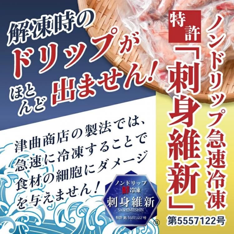 600g×2パック。お徳用パックで、お安くお買い求めいただけます。 1番のおすすめは、鮮度を楽しむお刺身。背中を開いて、背ワタを取り除いてお召し上がりください。 殻つきのまま、天ぷら・唐揚げ・かき揚げにしていただくのも絶品です! 津曲商店だからこそ、実現できたこの量と鮮度、ぜひご自宅でお楽しみください♪